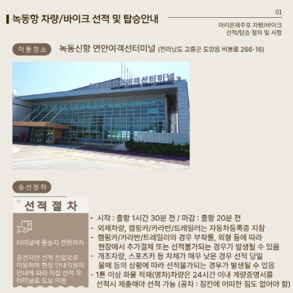 고흥(녹동항)의 차량 선적 절차는 다음과 같습니다. 먼저 동승자들은 전원 터미널에 하차하여야 합니다. 차량 운전자만 차량을 선적장으로 이동하여 차량을 선적합니다. 차량 운전자가 선적작업을 마치면 동승자와 함께 터미널에서 차량 선적 비용 결제, 승선권을 발급받습니다. 이때 탑승자 전원 신분증이 필수입니다.